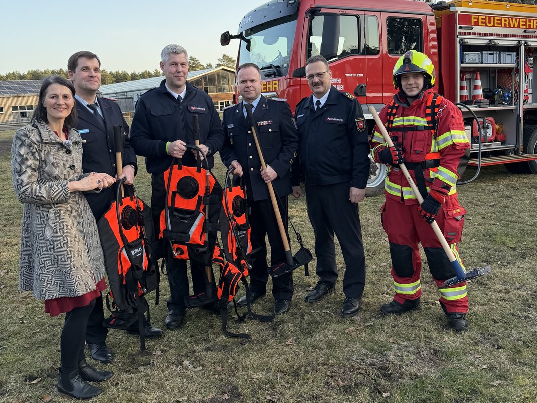 Adelheidsdorf, Lk Celle. Niedersachsens Wälder sind mit dem Fortschreiten des Klimawandels zunehmend von Waldbränden gefährdet. Im Rahmen einer Kooperation zwischen dem Niedersächsischen Ministerium für Ernährung, Landwirtschaft und Verbraucherschutz (ML) und dem Landesfeuerwehrverband Niedersachsen (LFV-NDS) werden gemeinsam präventive Maßnahmen erarbeitet und umgesetzt. Forstministerin Miriam Staudte hat daher heute in Adelheidsdorf (Landkreis Celle) 60 Löschrucksäcke inklusive spezieller Waldbrandwerkzeuge im Wert von rund 430 Euro pro Einheit an die Kreisfeuerwehrverbände in Waldbrand-Risikogebieten Niedersachsens übergeben.