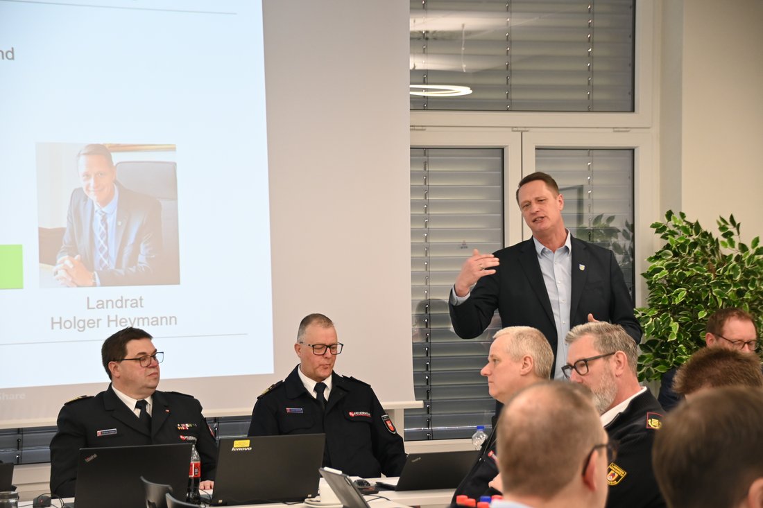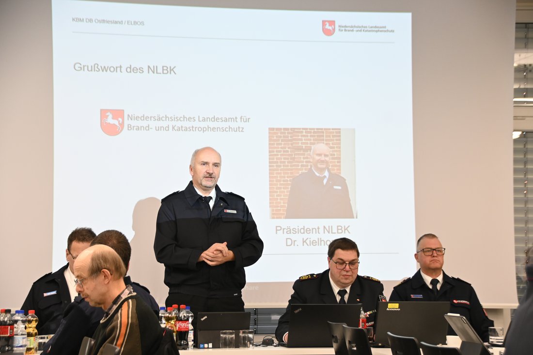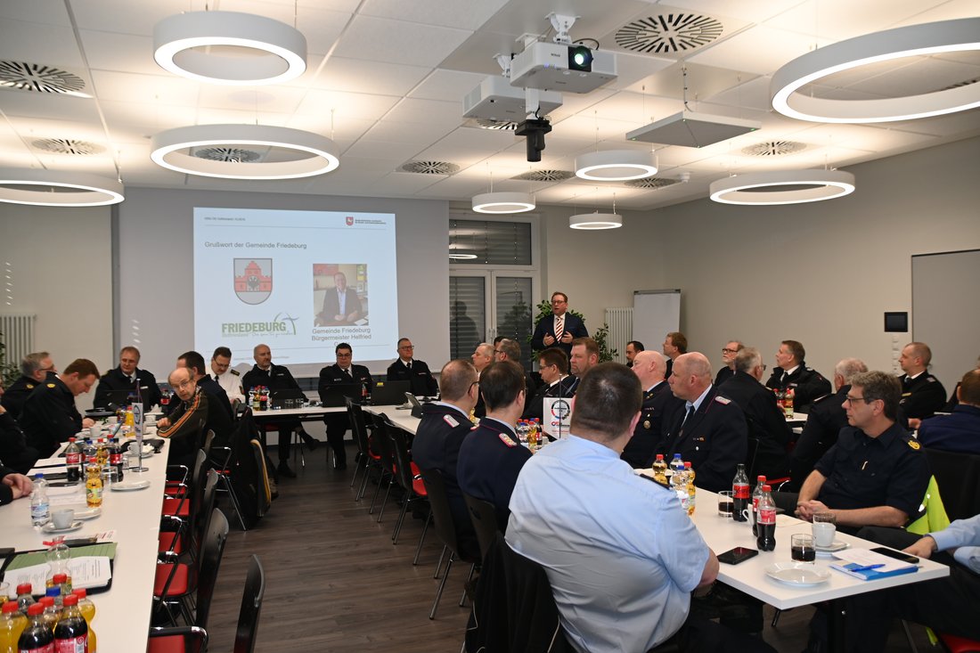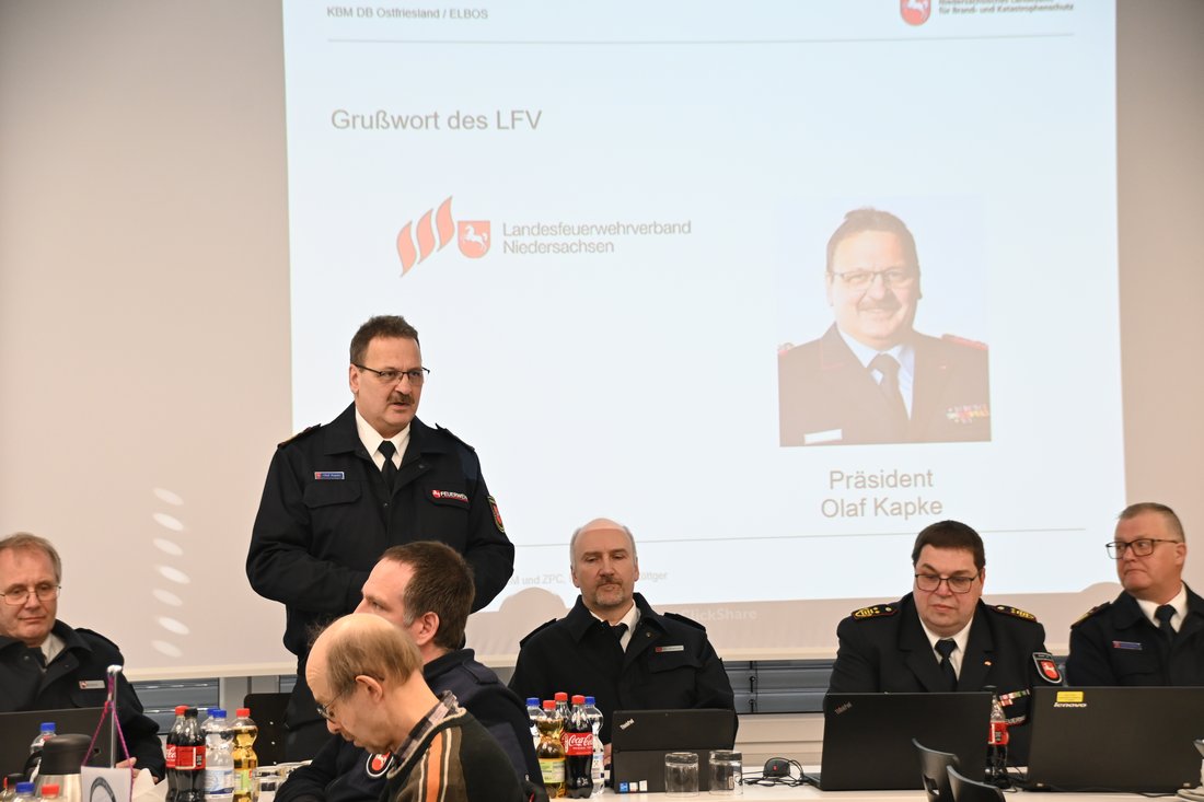 Zu Beginn der Sitzung begrüßten Regierungsbrandmeister Erwin Reiners und Regierungsbrandmeister Matthias Rötger die anwesenden Gäste, darunter Landrat Holger Heymann, den Bürgermeister der Gemeinde Friedeburg Hellfried Goetz, den Präsidenten des Niedersächsischen Landesamtes für Brand- und Katastrophenschutz (NLBK) Dr. Christian Kielhorn, den Präsidenten des Landesfeuerwehrverbandes (LFV) Olaf Kapke, Kreisbrandmeister Friedhelm Tannen sowie Regierungsbrandmeister Udo Schwarz.