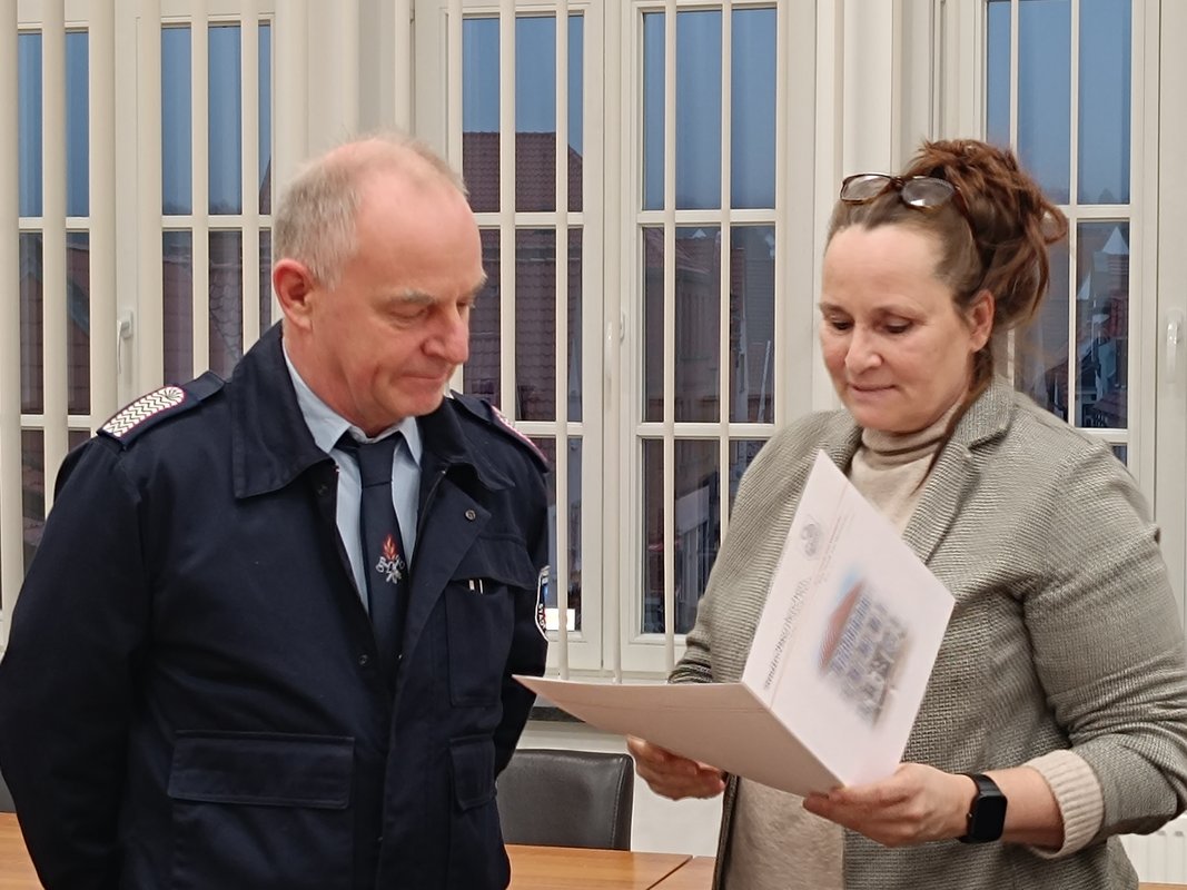 Bild 2: Stephan Konczak wird von Dörte Worm-Kressin zum Ortsbrandmeister der Ortsfeuerwehr Krainhagen-Röhrkasten ernannt.