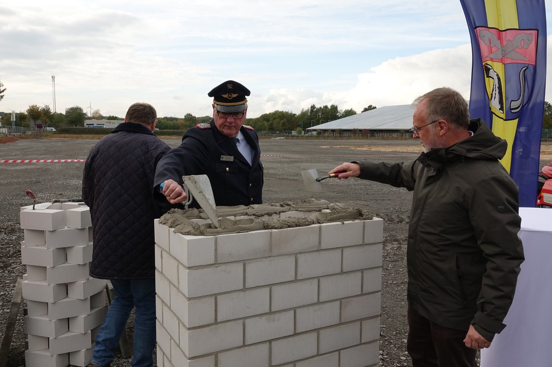 KBM Bernd Fischer und Landrat Detlev Kohlmeier mauern die Zeitkapsel ein