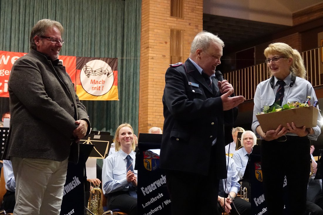 Bevor das Konzert nach mehreren Zugaben endete, überreichte Kreisstabführer Karl-Georg Gieseking an Peter Jenal eine Box mit Brokeloher Spezialitäten. Ralf Binner der das Orchester seit 2013 geleitet hat erhielt ebenfalls ein Präsent und übergab die Leitung an Julian Kohrs.