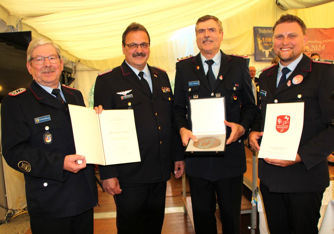 Von dem Vizepräsidenten des Deutschen Feuerwehrverbandes, Dr. Frank Kämmer, und dem Bundesstabführer Thorsten Zywietz, wurde den Jubilaren eine Dankesurkunde und der „Berliner Feuerbär“ überreicht.