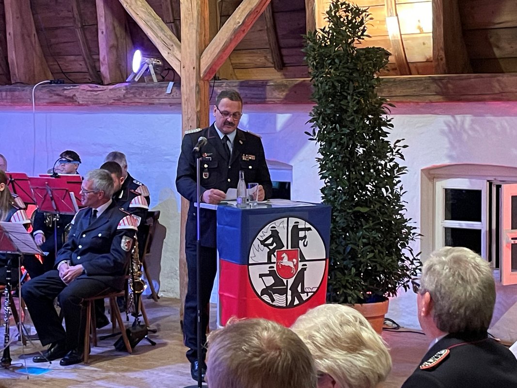 Landesstabführer Bodo Wartenberg blickte in seiner Laudatio auf 150 Jahre Feuerwehrmusik in Niedersachsen zurück. Er berichtete über die Anfänge der Musik in den Feuerwehren, die ihre Signalhörner nicht nur zur Alarmierung nutzten, sondern auch vielfältige Befehle der Kommandanten an die Einsatzkräfte weitergaben. So entwickelte sich aus der damaligen „Signal-Musik“ eine lebendige und gut ausgebildete Abteilung in den Feuerwehren, die neben den dienstlich veranlassten Auftritten auch unzählige Musikeinsätze der sog „Brauchtumspflege“ absolviert und stets ein gern gesehenes Aushängeschild der Feuerwehren geworden ist.